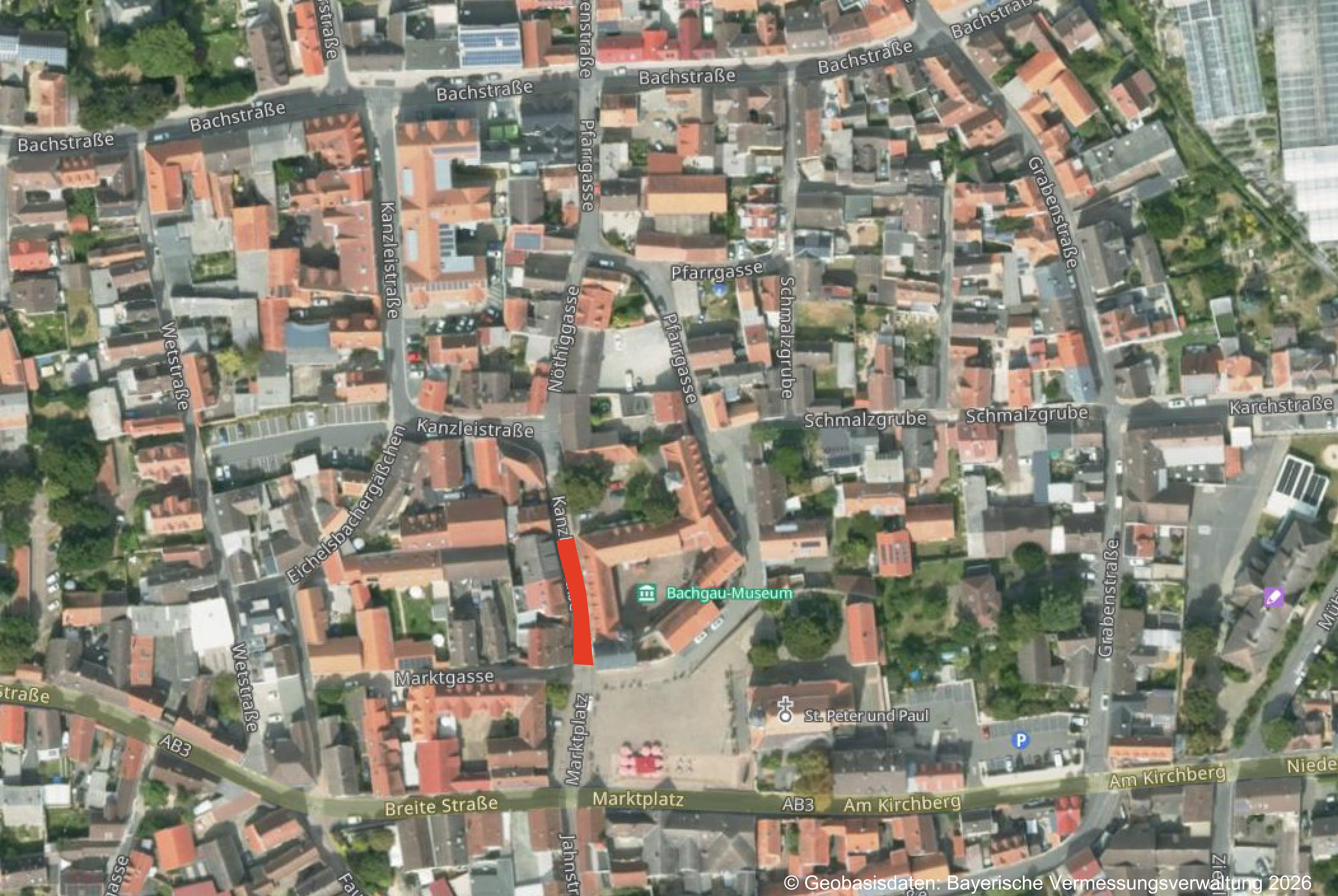 Die Kanzleistraße wird im Bereich der Hs.Nr. 3 voraussichtlich von Montag, den 16.02.2026 bis voraussichtlich Mitte März wegen einer Dachsanierung voll gesperrt. Der gesperrte Bereich kann über die Pfarrgasse umfahren werden.