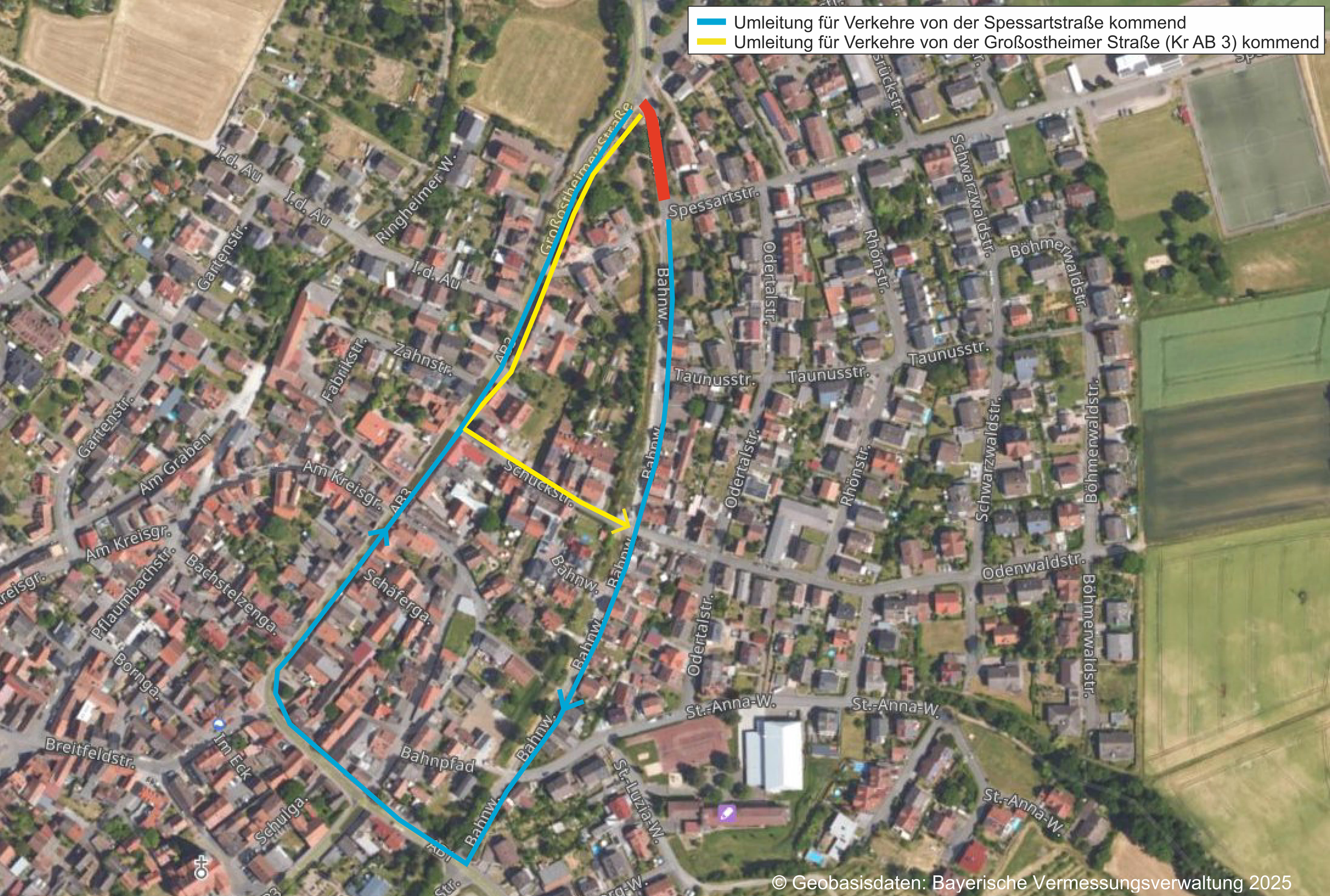 Der Bahnweg im Bereich zwischen der Einmündung zur Großostheimer Straße (Kr AB 3) und der Spessartstraße bleibt weiterhin bis vorraussichtlich zum 14.11.2025 wegen der Verlegung von Glasfaser voll gesperrt. Der gesperrte Bereich kann für Verkehre von der Spessartstraße kommend über den Bahnweg – Mömlinger Straße (Kr AB 1) – Rathausstraße (Kr AB 3) – Großostheimer Straße (Kr AB 3) und für Verkehre von der Großostheimer Straße kommend über die Großostheimer Straße (Kr AB 3) – Schuckstraße – Bahnweg (- Odenwaldstraße – Odertalstraße) umfahren werden.